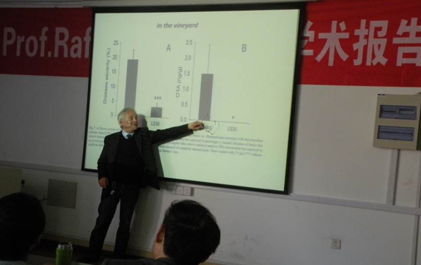 In addition, Professor Raffaello made two presentations titled "Biodegradation of mycotoxins - microbes in the service of man and animals “and " Research progress of antagonistic yeast control of apple patulin ", in the university and the school in separate occasions. The professor also, participated in four seminars of professor Hong-yin Zhang’s research team. He offered one-by-one guidance to all graduate students about their research work, and proposed suggestions on experimental designs. Moreover, professor Raffaello also guided the team on instrumental procedures and usage of RT-PCR and 2D on several occasions.