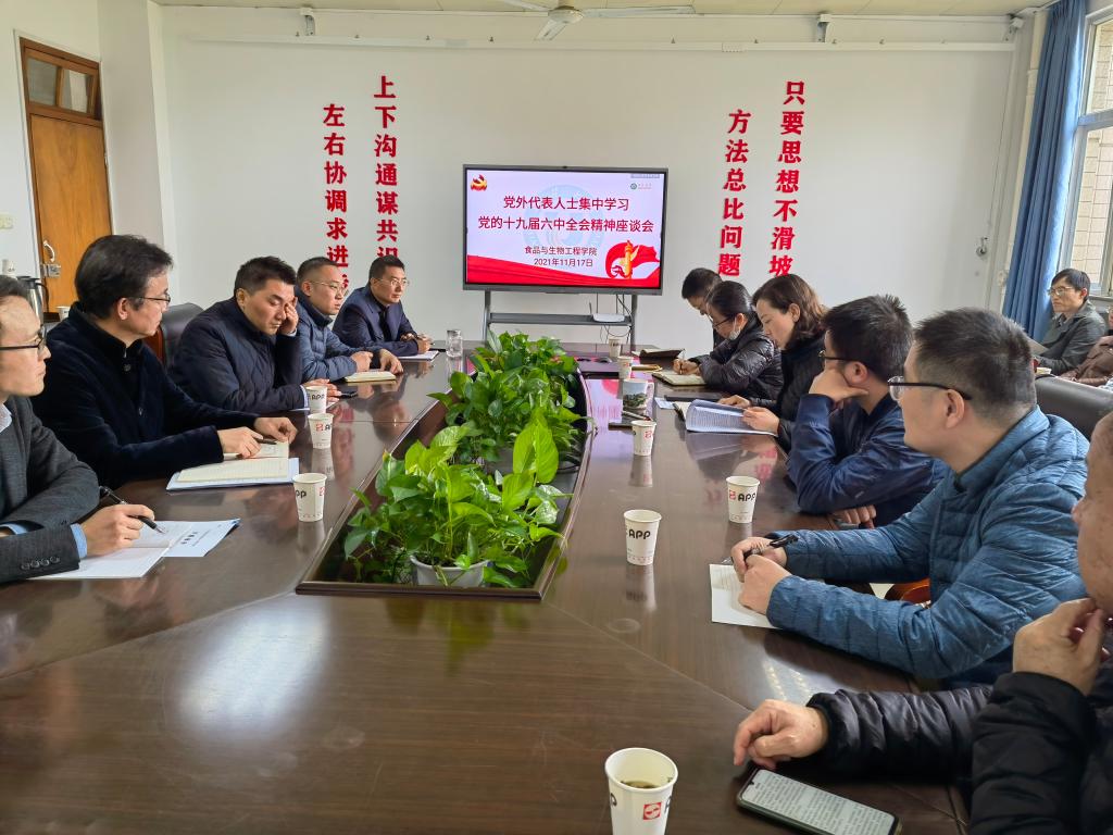 党外代表人士集中学习党的十九届六中全会精神座谈会在食品楼302会议室召开,来自全院各民主党派和党外人士代表20余人集中学习全会精神,进一步凝聚共识、坚定自信,为助力学院事业高质量发展团结奋斗。座谈会由学院党委书记万由令主持。