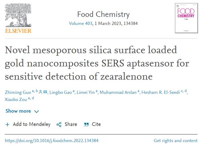 郭志明教授课题组在Food Chemistry (Q1)期刊上发表了题为"Novel mesoporous silica surface loaded gold nanocomposites SERS aptasensor for sensitive detection of Zearalenone"的研究论文。论文第一/通讯作者为郭志明教授,第二作者为硕士研究生高凌波,论文第一单位为成人影视片
