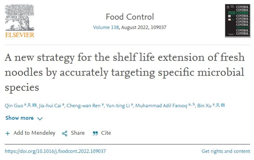 徐斌教授在Food Control在线发表题为“A new strategy for the shelf life extension of fresh noodles by accurately targeting specific microbial species”,首次针对生鲜面中优势靶标菌株开发出新型保鲜剂。采用该方法可以提高生鲜面的保鲜准确性和保鲜效率。成人影视片