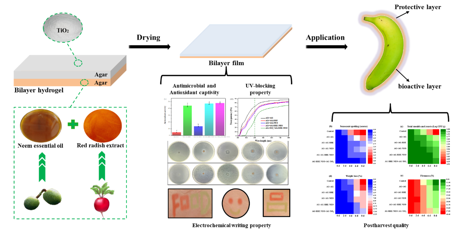 邹小波教授课题组题为“Agar/TiO2/radish anthocyanin/neem essential oil bionanocomposite bilayer films with improved bioactive capability and electrochemical writing property for banana preservation”的最新研究成果。该研究开发了一种带有绿色标签的缓释型双层薄膜体系,有效的改善了香蕉的贮藏品质。2020级博士生杨志坤、硕士生导师翟晓东为论文共同第一作者,邹小波教授为通讯作者。
