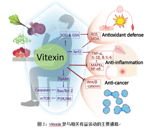 本文首先简要综述了vitexin的吸收和代谢,然后讨论了其对肠道菌群的影响,最后重点介绍了vitexin的生物活性及其相关分子机制的最新研究进展。