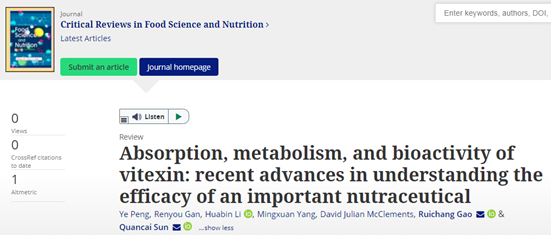 孙全才和高瑞昌教授为通讯作者的标题为”Absorption, metabolism, and bioactivity of vitexin: recent advances in understanding the efficacy of an important nutraceutical”的综述在《Critical Reviewsin Food Science and Nutrition》在线发表。