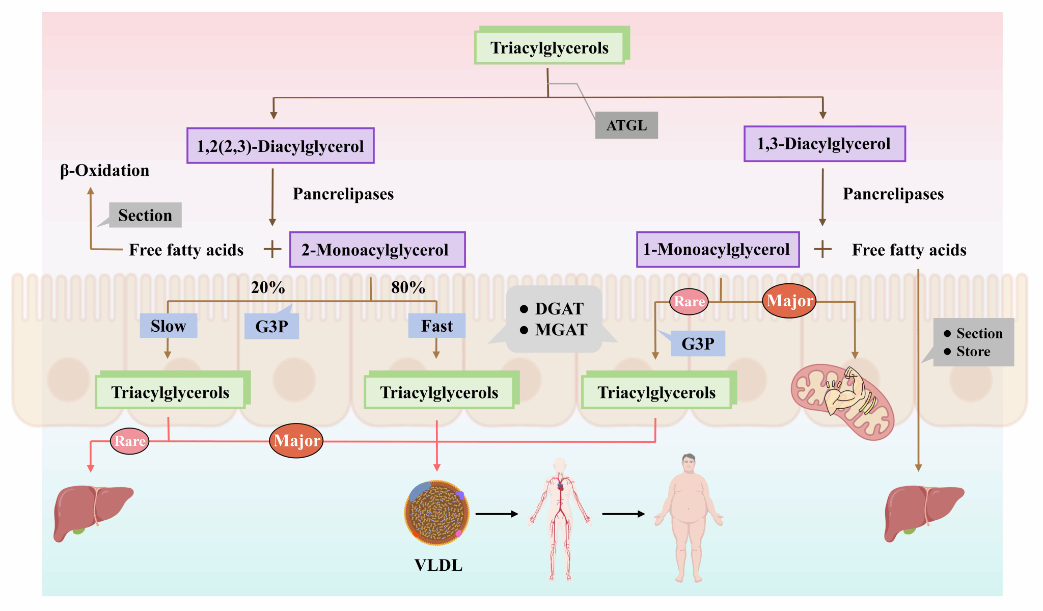 图1 单甘脂、甘油二酯(sn-1,3-甘油二酯、sn-1,2/2,3-甘油二酯)以及甘油三酯体内消化和代谢途径