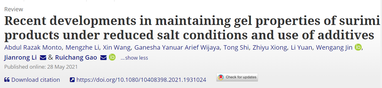 高瑞昌教授课题组在食品顶级期刊(TOP4)Critical Reviews in Food Science and Nutrition在线发表题为“Recent developments in maintaining gel properties of surimi products under reduced salt conditions and use of additives”的综述,系统阐述了如何在减盐条件下成功保持鱼糜凝胶性能的最新进展,为低盐和功能性鱼糜制品的未来发展提供参考。成人影视片